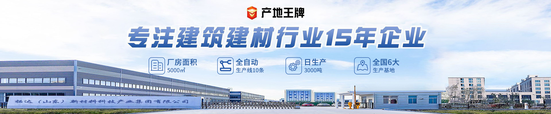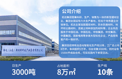 拓达(山东)新材料科技产业集团有限公司成立于2010年,年产值约30万吨。集团主营新型建材生产15年,目前拥有全自动智能化生产线20条,工厂总占地10万平,车间面积5万平,日出货量2000吨,同时设有15000成品仓库,可实现国内下单翌日达,公司自成立至今已实现材料总产值5000万元。拓达集团是集科研、生产、销售为一体的新型建材企业,公司全国已设有济南、佛山、南京、湖北、重庆、福州、莱芜七大生产基地,公司主营工程加固修补材料、地坪材料、防水防腐材料、混凝土添加剂等四大类产品,产品种类达300余款。企业先后服务于中国石油、中国石化、中铁集团、中交集团、中建 ...展开
